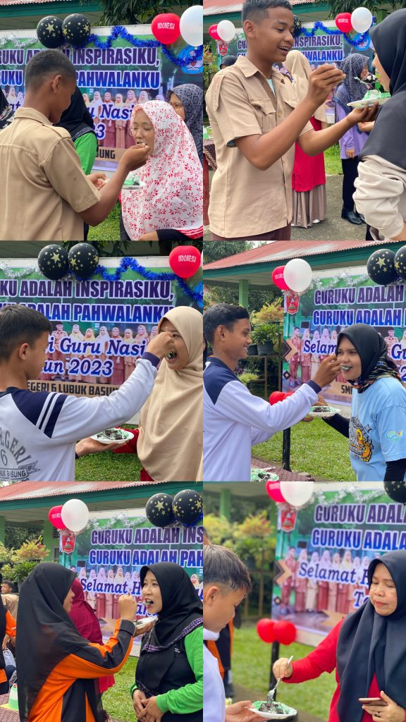 Pada tanggal 25 November 2023 Seluruh Siswa/i SMP NEGERI 6 Lubuk Basung mengadakan peringatan hari Guru di Sekolah tercinta tepatnya diLapangan SMP NEGERI 6 Lubuk Basung, wali kelas dan siswa siswi melaksanakan kegiatan di lapngan seperti bernyanyi dan berpuisi, potong kue, ditutup dengan bermaaf-maafan dan berfoto bersama.